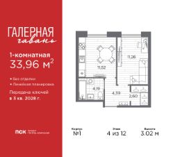 1-комн. квартира от застройщика в ЖК "Галерная гавань" на 4 этаже. Квартира без отделки, новый собственник может сделать ремонт по своему проекту. Общая площадь: 33.96 кв.м., жилая: 11.26 кв.м., площадь просторной кухни-столовой: 11.52 кв.м. Все окна выходят на одну сторону. В квартире один совмещенный санузел. Высота потолков 3.02 м.