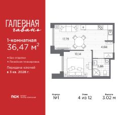 Однокомнатная квартира в ЖК "Галерная гавань" на 4 этаже. Квартира без отделки, после оформления собственности можно делать ремонт. Общая площадь: 36.47 кв.м., жилая: 10.14 кв.м., площадь просторной кухни-столовой: 17.79 кв.м. Все окна выходят на одну сторону. В квартире один совмещенный санузел. Высота потолков 3.02 м.