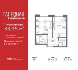 Просторная 1-комн. квартира в ЖК "Галерная гавань" на 9 этаже. Квартира без отделки, после получения ключей можно делать ремонт. Общая площадь: 33.96 кв.м., жилая: 11.26 кв.м., площадь просторной кухни-столовой: 11.52 кв.м. Все окна выходят на одну сторону. В квартире один совмещенный санузел. Высота потолков 3.02 м.