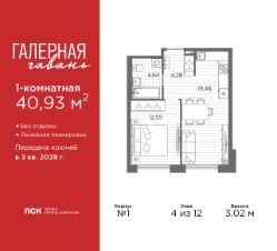 1-комн. квартира в ЖК "Галерная гавань" на 4 этаже. Квартира без отделки, новый владелец может сделать ремонт по своему проекту. Общая площадь: 40.93 кв.м., жилая: 12.55 кв.м., площадь просторной кухни-столовой: 19.46 кв.м. Все окна выходят на одну сторону. В квартире один совмещенный санузел. Высота потолков 3.02 м.
