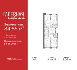 Трехкомнатная квартира в ЖК "Галерная гавань" на 4 этаже. Квартира без отделки, новый собственник может сделать ремонт по индивидуальному дизайн-проекту. Общая площадь: 84.85 кв.м., жилая: 42.12 кв.м., площадь просторной кухни-столовой: 18.95 кв.м. Квартира - распашонка, без проходных комнат, окна выходят на paзные стороны дома. В квартире два совмещенных и один раздельный санузел. Высота потолков 3.02 м.