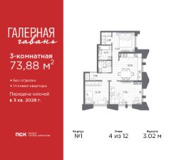 3-комн. квартира в ЖК "Галерная гавань" на 4 этаже. Квартира без отделки, после оформления собственности можно делать ремонт. Общая площадь: 73.88 кв.м., жилая: 41.26 кв.м., площадь просторной кухни-столовой: 13.95 кв.м. Квартира угловая, очень светлая, естественная вентиляция при открытии окон. В квартире два совмещенных санузла. Высота потолков 3.02 м.