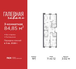 Просторная трехкомнатная квартира в ЖК "Галерная гавань" на 11 этаже. Квартира без отделки, после получения ключей можно делать ремонт. Общая площадь: 84.85 кв.м., жилая: 42.12 кв.м., площадь просторной кухни-столовой: 18.95 кв.м. Квартира - распашонка, без проходных комнат, окна выходят на paзные стороны дома. В квартире два совмещенных и один раздельный санузел. Высота потолков 3.02 м.
