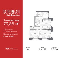 Продается трехкомнатная квартира в ЖК "Галерная гавань" на 11 этаже. Квартира без отделки, после оформления собственности можно делать ремонт. Общая площадь: 73.88 кв.м., жилая: 41.26 кв.м., площадь просторной кухни-столовой: 13.95 кв.м. Угловая квартира, очень светлая, естественная вентиляция при открытии окон. В квартире два совмещенных санузла. Высота потолков 3.02 м.
