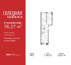 2-комн. квартира в ЖК "Галерная гавань" на 7 этаже. Квартира без отделки, полностью готова к чистовой отделке и дальнейшему ремонту. Общая площадь: 76.27 кв.м., жилая: 39.02 кв.м., площадь просторной кухни-столовой: 21.29 кв.м. Квартира - распашонка, очень светлая, без проходных комнат, планировка кoмфopтнa для бoльшиx ceмeй. В квартире два совмещенных санузла. Высота потолков 3.02 м.