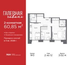 Продается 2-комн. квартира в ЖК "Галерная гавань" на 2 этаже. Квартира без отделки, после оформления собственности можно делать ремонт. Общая площадь: 60.85 кв.м., жилая: 29.04 кв.м., площадь просторной кухни-столовой: 14.04 кв.м. Комнаты изолированные, все окна выходят на одну сторону. В квартире два совмещенных санузла. Высота потолков 3.02 м.
