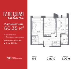 Двухкомнатная квартира в ЖК "Галерная гавань" на 2 этаже. Квартира без отделки, новый собственник может сделать ремонт по своему проекту. Общая площадь: 60.35 кв.м., жилая: 30.26 кв.м., площадь просторной кухни-столовой: 12.47 кв.м. Комнаты изолированные, все окна выходят на одну сторону. В квартире два совмещенных санузла. Высота потолков 3.02 м.