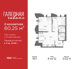 Продается 2-комн. квартира в ЖК "Галерная гавань" на 4 этаже. Квартира без отделки, после получения ключей можно делать ремонт. Общая площадь: 60.25 кв.м., жилая: 28.3 кв.м., площадь просторной кухни-столовой: 18.17 кв.м. Квартира угловая, идеально подойдет любителям тишины и панорамных видов. В квартире два совмещенных санузла. Высота потолков 3.02 м.
