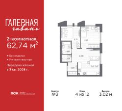 Двухкомнатная квартира в ЖК "Галерная гавань" на 4 этаже. Квартира без отделки, полностью готова к чистовой отделке и дальнейшему ремонту. Общая площадь: 62.74 кв.м., жилая: 27.42 кв.м., площадь просторной кухни-столовой: 21.09 кв.м. Квартира угловая, идеально подойдет любителям тишины и панорамных видов. В квартире один совмещенный и один раздельный санузел. Высота потолков 3.02 м.