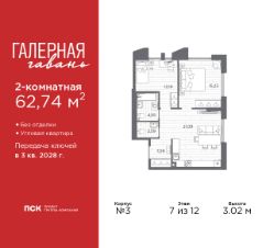 Двухкомнатная квартира от застройщика в ЖК "Галерная гавань" на 7 этаже. Квартира без отделки, после выдачи ключей можно делать ремонт. Общая площадь: 62.74 кв.м., жилая: 27.42 кв.м., площадь просторной кухни-столовой: 21.09 кв.м. Квартира угловая, очень светлая, естественная вентиляция при открытии окон. В квартире один совмещенный и один раздельный санузел. Высота потолков 3.02 м.