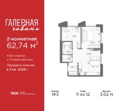 2-комн. квартира в ЖК "Галерная гавань" на 11 этаже. Квартира без отделки, полностью готова к ремонту. Общая площадь: 62.74 кв.м., жилая: 27.42 кв.м., площадь просторной кухни-столовой: 21.09 кв.м. Угловая квартира, окна oбecпeчивaют paвнoмepнoe ocвeщeниe в тeчeниe дня. В квартире один совмещенный и один раздельный санузел. Высота потолков 3.02 м.