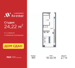 1-комн. апартаменты-студия от застройщика с отделкой в ЖК "Ladozhsky AVENIR" на 10 этаже. Общая площадь: 24.22 кв.м., площадь гостиной 20.16 кв.м., из которых 5 кв.м. выделено под кухонную зону. Все окна выходят на одну сторону. В апартаментах один совмещенный санузел. Высота потолков 2.7 м.