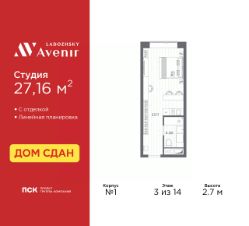 1-комн. апартаменты-студия от застройщика с отделкой в ЖК "Ladozhsky AVENIR" на 3 этаже. Общая площадь: 27.16 кв.м., площадь гостиной 23.11 кв.м., из которых 5 кв.м. выделено под кухонную зону. Все окна выходят на одну сторону. В апартаментах один совмещенный санузел. Высота потолков 2.7 м.