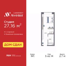 Однокомнатные апартаменты-студия с отделкой в ЖК "Ladozhsky AVENIR" на 5 этаже. Общая площадь: 27.16 кв.м., площадь гостиной 23.11 кв.м., из которых 5 кв.м. выделено под кухонную зону. Все окна выходят на одну сторону. В апартаментах один совмещенный санузел. Высота потолков 2.7 м.