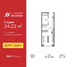 Продаются 1-комн. апартаменты-студия от застройщика с отделкой в ЖК "Ladozhsky AVENIR" на 6 этаже. Общая площадь: 24.22 кв.м., площадь гостиной 20.16 кв.м., из которых 5 кв.м. выделено под кухонную зону. Все окна выходят на одну сторону. В апартаментах один совмещенный санузел. Высота потолков 2.7 м.