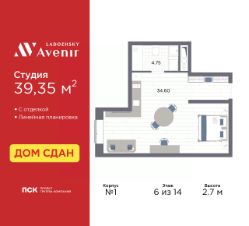 Просторные 1-комн. апартаменты-студия с отделкой в ЖК "Ladozhsky AVENIR" на 6 этаже. Общая площадь: 39.35 кв.м., площадь гостиной 34.6 кв.м., из которых 5 кв.м. выделено под кухонную зону. Все окна выходят на одну сторону. В апартаментах один совмещенный санузел. Высота потолков 2.7 м.