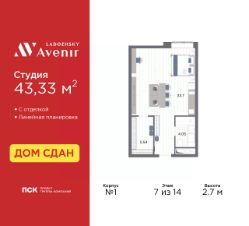1-комн. апартаменты-студия от застройщика с отделкой в ЖК "Ladozhsky AVENIR" на 7 этаже. Общая площадь: 43.33 кв.м., площадь гостиной 33.7 кв.м., из которых 5 кв.м. выделено под кухонную зону. Все окна выходят на одну сторону. В апартаментах один совмещенный санузел. Высота потолков 2.7 м.