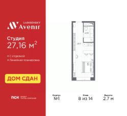 Однокомнатные апартаменты-студия с отделкой в ЖК "Ladozhsky AVENIR" на 8 этаже. Общая площадь: 27.16 кв.м., площадь гостиной 23.11 кв.м., из которых 5 кв.м. выделено под кухонную зону. Все окна выходят на одну сторону. В апартаментах один совмещенный санузел. Высота потолков 2.7 м.