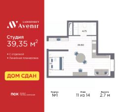 Продаются однокомнатные апартаменты-студия от застройщика с отделкой в ЖК "Ladozhsky AVENIR" на 11 этаже. Общая площадь: 39.35 кв.м., площадь гостиной 34.6 кв.м., из которых 5 кв.м. выделено под кухонную зону. Все окна выходят на одну сторону. В апартаментах один совмещенный санузел. Высота потолков 2.7 м.
