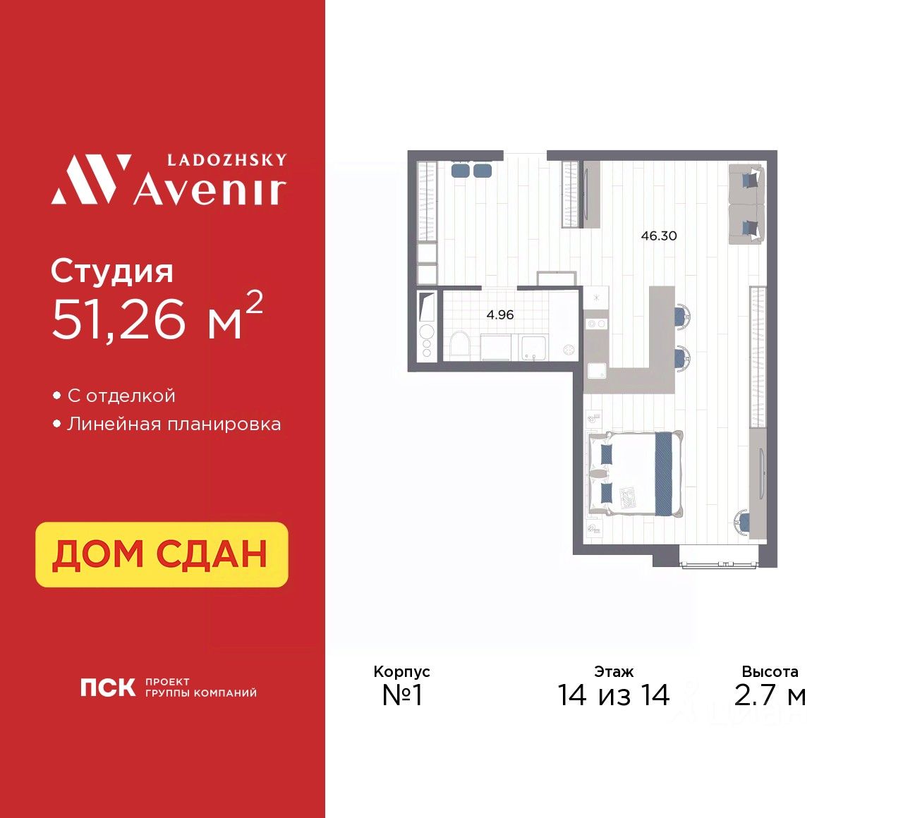1-комн. апартаменты-студия от застройщика с отделкой в ЖК "Ladozhsky AVENIR" на 14 этаже. Общая площадь: 51.26 кв.м., площадь гостиной 46.3 кв.м., из которых 10 кв.м. выделено под кухонную зону. Все окна выходят на одну сторону. В апартаментах один совмещенный санузел. Высота потолков 2.7 м.