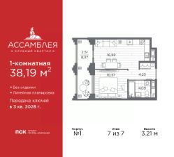 1-комн. квартира от застройщика в Клубный квартал "Ассамблея" на 7 этаже. Квартира без отделки, после оформления собственности можно делать ремонт. Общая площадь: 38.19 кв.м., жилая: 10.37 кв.м., площадь просторной кухни-столовой: 16.99 кв.м. Все окна выходят на одну сторону. В квартире один балкон, один совмещенный санузел. Высота потолков 3.21 м.