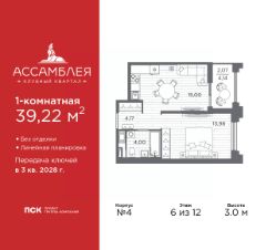 1-комн. квартира от застройщика в Клубный квартал "Ассамблея" на 6 этаже. Квартира без отделки, полностью готова к ремонту. Общая площадь: 39.22 кв.м., жилая: 13.98 кв.м., площадь просторной кухни-столовой: 15 кв.м. Все окна выходят на одну сторону. В квартире одна лоджия, один совмещенный санузел. Высота потолков 3.0 м.