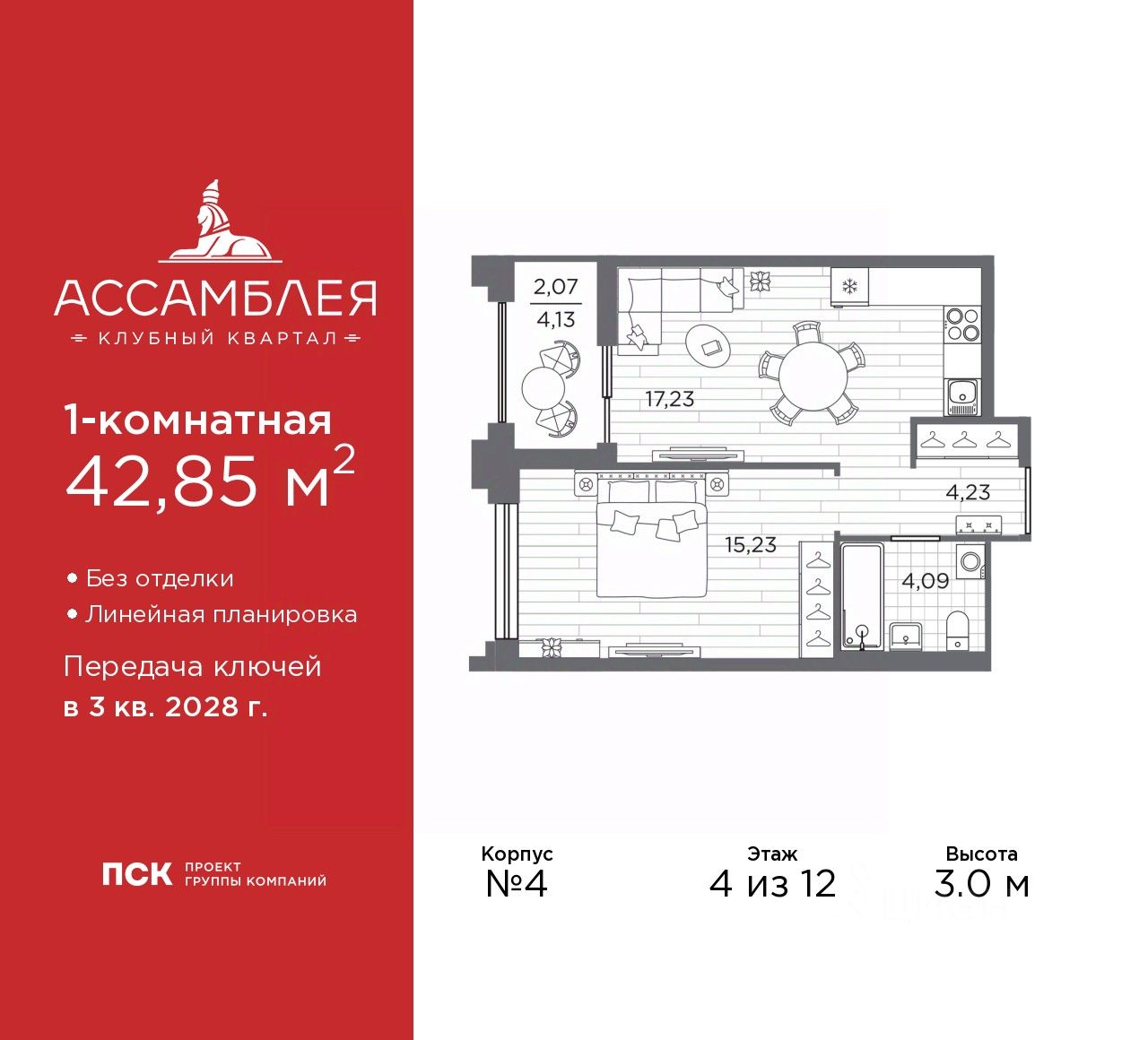 1-комн. квартира от застройщика в Клубный квартал "Ассамблея" на 4 этаже. Квартира без отделки, после получения ключей можно делать ремонт. Общая площадь: 42.85 кв.м., жилая: 15.23 кв.м., площадь просторной кухни-столовой: 17.23 кв.м. Все окна выходят на одну сторону. В квартире одна лоджия, один совмещенный санузел. Высота потолков 3.0 м.
