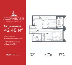 Однокомнатная квартира от застройщика в Клубный квартал "Ассамблея" на 2 этаже. Квартира без отделки, после выдачи ключей можно делать ремонт. Общая площадь: 42.48 кв.м., жилая: 15.23 кв.м., площадь просторной кухни-столовой: 16.77 кв.м. Все окна выходят на одну сторону. В квартире одна лоджия, один совмещенный санузел. Высота потолков 3.0 м.