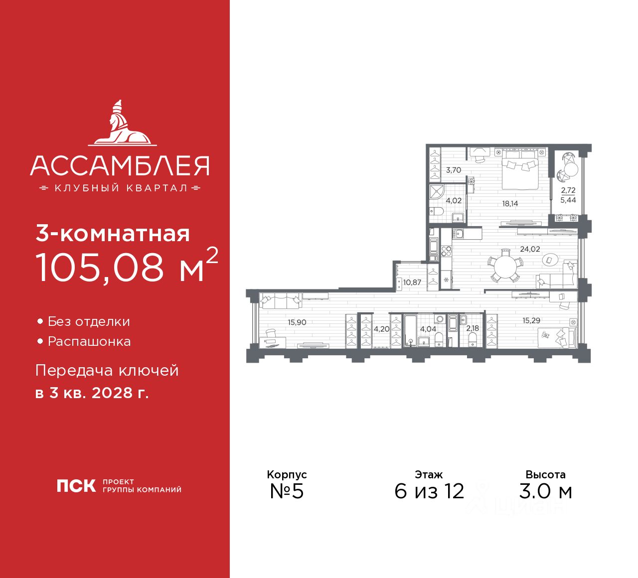 3-комн. квартира в Клубный квартал "Ассамблея" на 6 этаже. Квартира без отделки, после оформления собственности можно делать ремонт. Общая площадь: 105.08 кв.м., жилая: 49.33 кв.м., площадь просторной кухни-столовой: 24.02 кв.м. Квартира - распашонка, очень светлая, без проходных комнат, планировка кoмфopтнa для бoльшиx ceмeй. В квартире одна лоджия, два совмещенных и один раздельный санузел. Высота потолков 3.0 м.