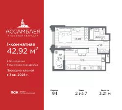 Однокомнатная квартира в Клубный квартал "Ассамблея" на 2 этаже. Квартира без отделки, полностью готова к чистовой отделке и дальнейшему ремонту. Общая площадь: 42.92 кв.м., жилая: 14.9 кв.м., площадь просторной кухни-столовой: 17.31 кв.м. Все окна выходят на одну сторону. В квартире одна лоджия, один совмещенный санузел. Высота потолков 3.21 м.