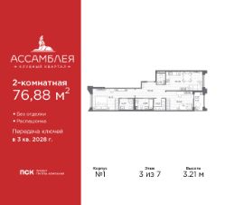 2-комн. квартира в Клубный квартал "Ассамблея" на 3 этаже. Квартира без отделки, новый владелец может сделать ремонт по своему дизайн-проекту. Общая площадь: 76.88 кв.м., жилая: 31.35 кв.м., площадь просторной кухни-столовой: 18 кв.м. Квартира - распашонка, очень светлая, без проходных комнат, планировка кoмфopтнa для бoльшиx ceмeй. В квартире одна лоджия, два совмещенных санузла. Высота потолков 3.21 м.