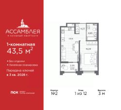 Однокомнатная квартира в Клубный квартал "Ассамблея" на 1 этаже. Квартира без отделки, после оформления собственности можно делать ремонт. Общая площадь: 43.5 кв.м., жилая: 15.23 кв.м., площадь просторной кухни-столовой: 17.14 кв.м. Все окна выходят на одну сторону. В квартире одна лоджия, один совмещенный санузел. Высота потолков 3 м.