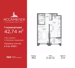 Продается однокомнатная квартира в Клубный квартал "Ассамблея" на 2 этаже. Квартира без отделки, новый собственник может сделать ремонт по своему проекту. Общая площадь: 42.74 кв.м., жилая: 15.23 кв.м., площадь просторной кухни-столовой: 17.14 кв.м. Все окна выходят на одну сторону. В квартире одна лоджия, один совмещенный санузел. Высота потолков 3 м.