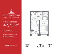 Просторная 1-комн. квартира в Клубный квартал "Ассамблея" на 2 этаже. Квартира без отделки, полностью готова к ремонту. Общая площадь: 42.75 кв.м., жилая: 15.23 кв.м., площадь просторной кухни-столовой: 16.91 кв.м. Все окна выходят на одну сторону. В квартире одна лоджия, один совмещенный санузел. Высота потолков 3 м.
