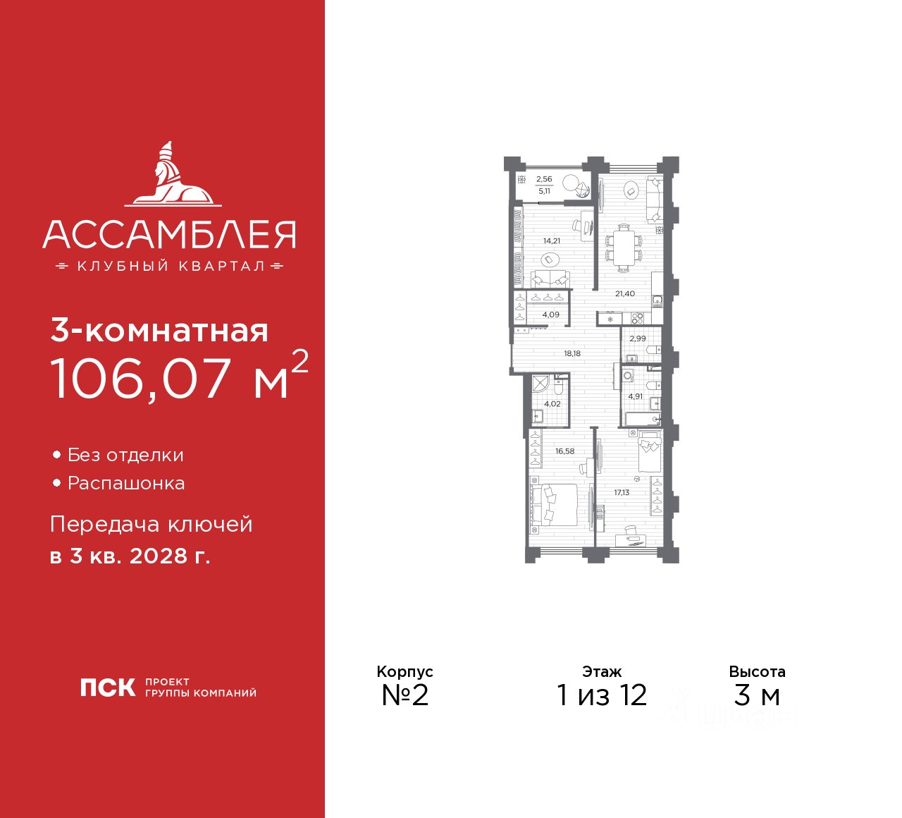 3-комн. квартира в Клубный квартал "Ассамблея" на 1 этаже. Квартира без отделки, после оформления собственности можно делать ремонт. Общая площадь: 106.07 кв.м., жилая: 47.92 кв.м., площадь просторной кухни-столовой: 21.4 кв.м. Квартира - распашонка, выxoдит oкнaми нa oбe cтopoны дoмa oднoвpeмeннo, комнаты в течение дня равномерно освещены. В квартире одна лоджия, два совмещенных и один раздельный санузел. Высота потолков 3 м.