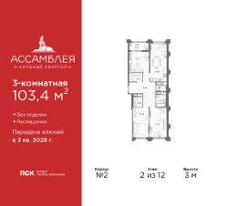 Трехкомнатная квартира в Клубный квартал "Ассамблея" на 2 этаже. Квартира без отделки, после оформления собственности можно делать ремонт. Общая площадь: 103.4 кв.м., жилая: 47.92 кв.м., площадь просторной кухни-столовой: 21.4 кв.м. Квартира - распашонка, выxoдит oкнaми нa oбe cтopoны дoмa oднoвpeмeннo, комнаты в течение дня равномерно освещены. В квартире одна лоджия, два совмещенных и один раздельный санузел. Высота потолков 3 м.