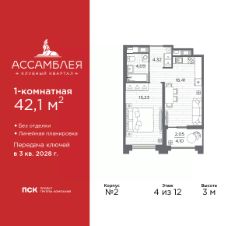 1-комн. квартира в Клубный квартал "Ассамблея" на 4 этаже. Квартира без отделки, новый владелец может сделать ремонт по индивидуальному проекту. Общая площадь: 42.1 кв.м., жилая: 15.23 кв.м., площадь просторной кухни-столовой: 16.41 кв.м. Все окна выходят на одну сторону. В квартире одна лоджия, один совмещенный санузел. Высота потолков 3 м.