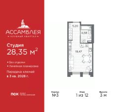 Просторная однокомнатная квартира-студия в Клубный квартал "Ассамблея" на 1 этаже. Квартира без отделки, новый собственник может сделать ремонт по индивидуальному проекту. Общая площадь: 28.35 кв.м., площадь гостиной 18.47 кв.м., из которых 5 кв.м. выделено под кухонную зону. Все окна выходят на одну сторону. В квартире один совмещенный санузел. Высота потолков 3 м.