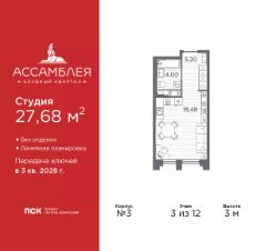 Продается 1-комн. квартира-студия в Клубный квартал "Ассамблея" на 3 этаже. Квартира без отделки, новый собственник может сделать ремонт по своему проекту. Общая площадь: 27.68 кв.м., площадь гостиной 18.48 кв.м., из которых 5 кв.м. выделено под кухонную зону. Все окна выходят на одну сторону. В квартире один совмещенный санузел. Высота потолков 3 м.