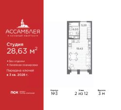 Однокомнатная квартира-студия от застройщика в Клубный квартал "Ассамблея" на 2 этаже. Квартира без отделки, после выдачи ключей можно делать ремонт. Общая площадь: 28.63 кв.м., площадь гостиной 19.43 кв.м., из которых 5 кв.м. выделено под кухонную зону. Все окна выходят на одну сторону. В квартире один совмещенный санузел. Высота потолков 3 м.