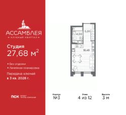 Продается 1-комн. квартира-студия в Клубный квартал "Ассамблея" на 4 этаже. Квартира без отделки, полностью готова к ремонту. Общая площадь: 27.68 кв.м., площадь гостиной 18.48 кв.м., из которых 5 кв.м. выделено под кухонную зону. Все окна выходят на одну сторону. В квартире один совмещенный санузел. Высота потолков 3 м.