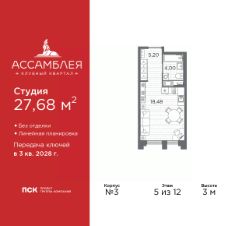 1-комн. квартира-студия от застройщика в Клубный квартал "Ассамблея" на 5 этаже. Квартира без отделки, полностью готова к чистовой отделке и дальнейшему ремонту. Общая площадь: 27.68 кв.м., площадь гостиной 18.48 кв.м., из которых 5 кв.м. выделено под кухонную зону. Все окна выходят на одну сторону. В квартире один совмещенный санузел. Высота потолков 3 м.
