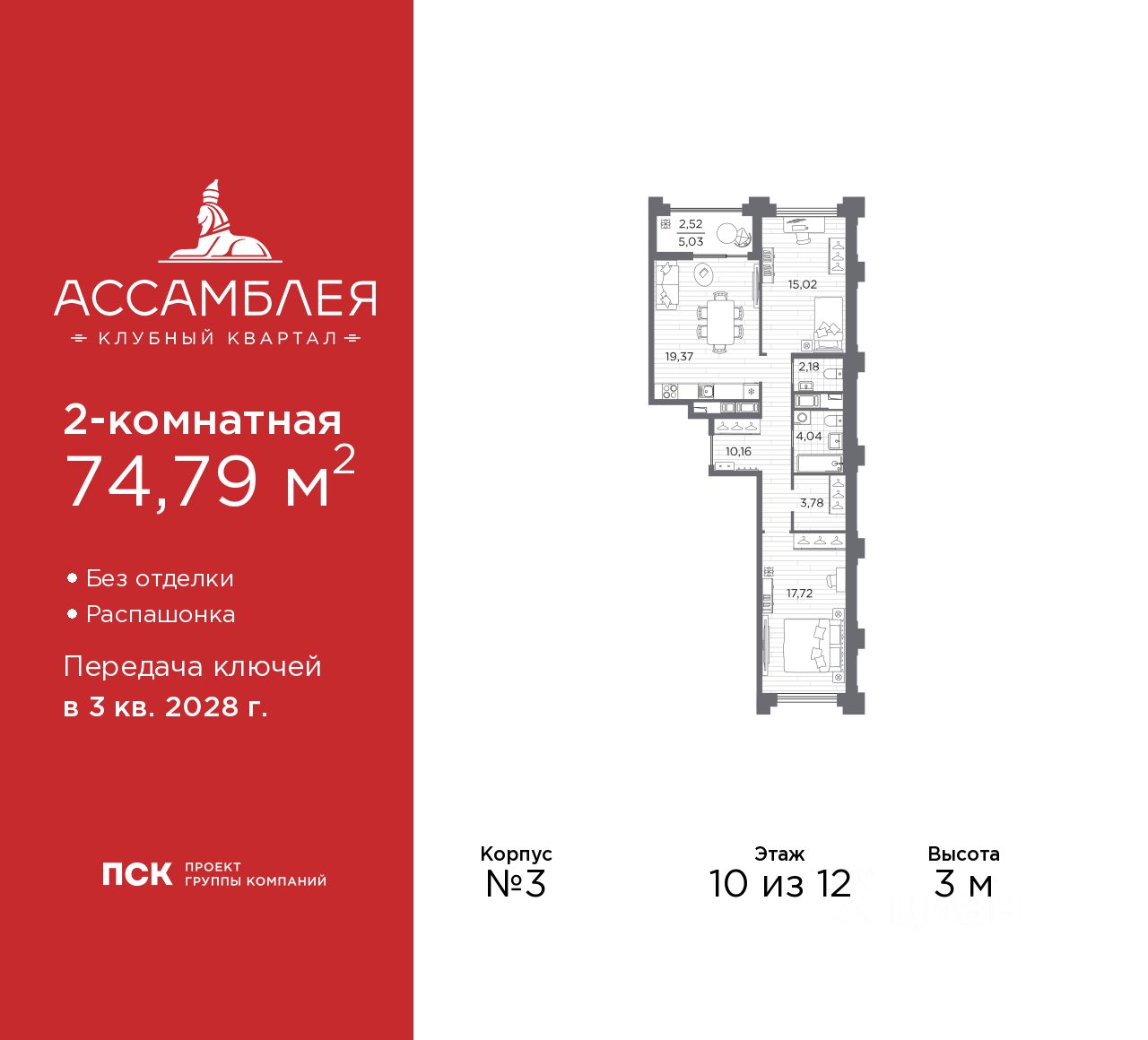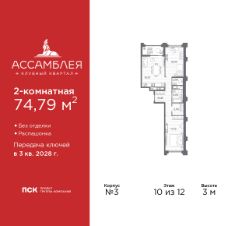 Просторная 2-комн. квартира в Клубный квартал "Ассамблея" на 10 этаже. Квартира без отделки, после получения ключей можно делать ремонт. Общая площадь: 74.79 кв.м., жилая: 32.74 кв.м., площадь просторной кухни-столовой: 19.37 кв.м. Квартира - распашонка, без проходных комнат, окна выходят на paзные стороны дома. В квартире одна лоджия, один совмещенный и один раздельный санузел. Высота потолков 3 м.