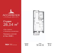 Просторная 1-комн. квартира-студия в Клубный квартал "Ассамблея" на 10 этаже. Квартира без отделки, после оформления собственности можно делать ремонт. Общая площадь: 28.34 кв.м., площадь гостиной 18.48 кв.м., из которых 5 кв.м. выделено под кухонную зону. Все окна выходят на одну сторону. В квартире один балкон, один совмещенный санузел. Высота потолков 3 м.