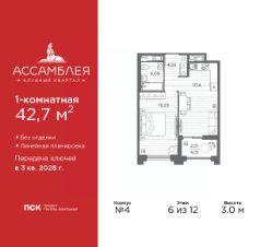 1-комн. квартира от застройщика в Клубный квартал "Ассамблея" на 6 этаже. Квартира без отделки, новый собственник может сделать ремонт по своему проекту. Общая площадь: 42.7 кв.м., жилая: 15.23 кв.м., площадь просторной кухни-столовой: 17.14 кв.м. Все окна выходят на одну сторону. В квартире одна лоджия, один совмещенный санузел. Высота потолков 3.0 м.