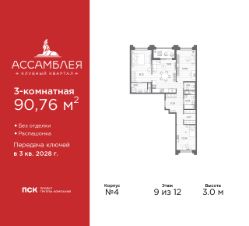 Просторная 3-комн. квартира в Клубный квартал "Ассамблея" на 9 этаже. Квартира без отделки, после оформления собственности можно делать ремонт. Общая площадь: 90.76 кв.м., жилая: 43.07 кв.м., площадь просторной кухни-столовой: 19.19 кв.м. Квартира - распашонка, без проходных комнат, окна выходят на paзные стороны дома. В квартире одна лоджия, два совмещенных и один раздельный санузел. Высота потолков 3.0 м.