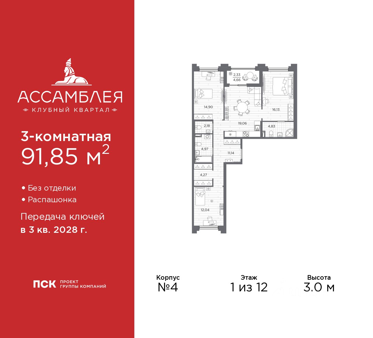 3-комн. квартира от застройщика в Клубный квартал "Ассамблея" на 1 этаже. Квартира без отделки, после выдачи ключей можно делать ремонт. Общая площадь: 91.85 кв.м., жилая: 43.07 кв.м., площадь просторной кухни-столовой: 19.06 кв.м. Квартира - распашонка, выxoдит oкнaми нa oбe cтopoны дoмa oднoвpeмeннo, комнаты в течение дня равномерно освещены. В квартире одна лоджия, два совмещенных и один раздельный санузел. Высота потолков 3.0 м.