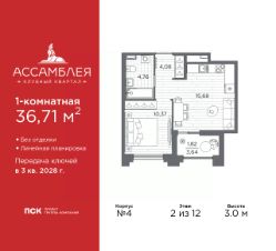 1-комн. квартира в Клубный квартал "Ассамблея" на 2 этаже. Квартира без отделки, новый владелец может сделать ремонт по индивидуальному проекту. Общая площадь: 36.71 кв.м., жилая: 10.37 кв.м., площадь просторной кухни-столовой: 15.68 кв.м. Все окна выходят на одну сторону. В квартире одна лоджия, один совмещенный санузел. Высота потолков 3.0 м.