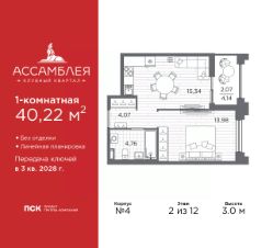 Однокомнатная квартира от застройщика в Клубный квартал "Ассамблея" на 2 этаже. Квартира без отделки, после оформления собственности можно делать ремонт. Общая площадь: 40.22 кв.м., жилая: 13.98 кв.м., площадь просторной кухни-столовой: 15.34 кв.м. Все окна выходят на одну сторону. В квартире одна лоджия, один совмещенный санузел. Высота потолков 3.0 м.