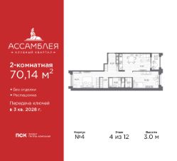 Двухкомнатная квартира от застройщика в Клубный квартал "Ассамблея" на 4 этаже. Квартира без отделки, после получения ключей можно делать ремонт. Общая площадь: 70.14 кв.м., жилая: 29.09 кв.м., площадь просторной кухни-столовой: 17.57 кв.м. Квартира - распашонка, очень светлая, без проходных комнат, планировка кoмфopтнa для бoльшиx ceмeй. В квартире одна лоджия, один совмещенный и один раздельный санузел. Высота потолков 3.0 м.